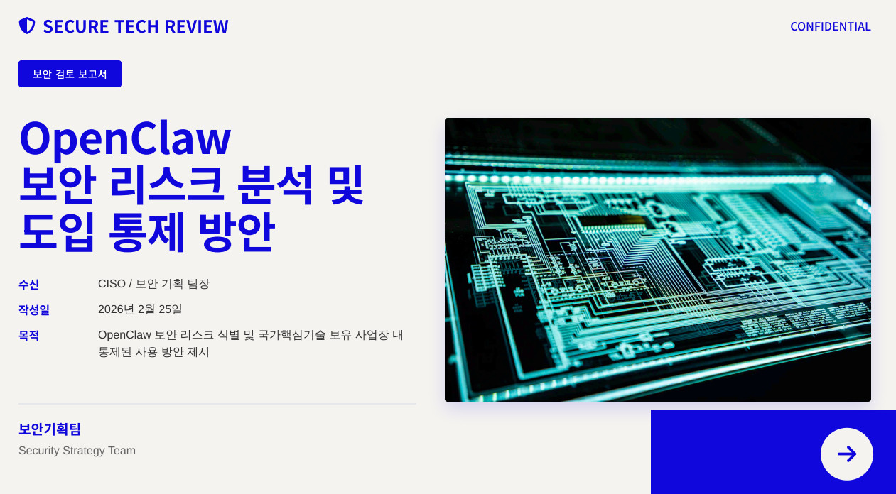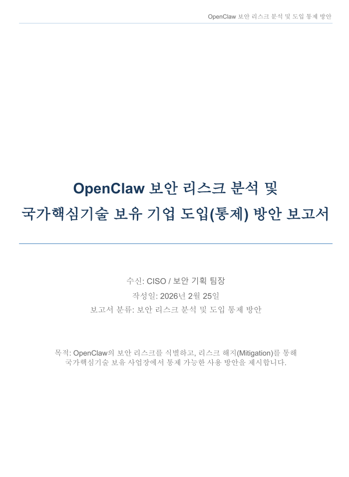 상세 보고서 다운로드: OpenClaw 보안 리스크 분석 및 국가핵심기술 보유 기업 도입(통제) 방안 보고서 (세로/PDF)