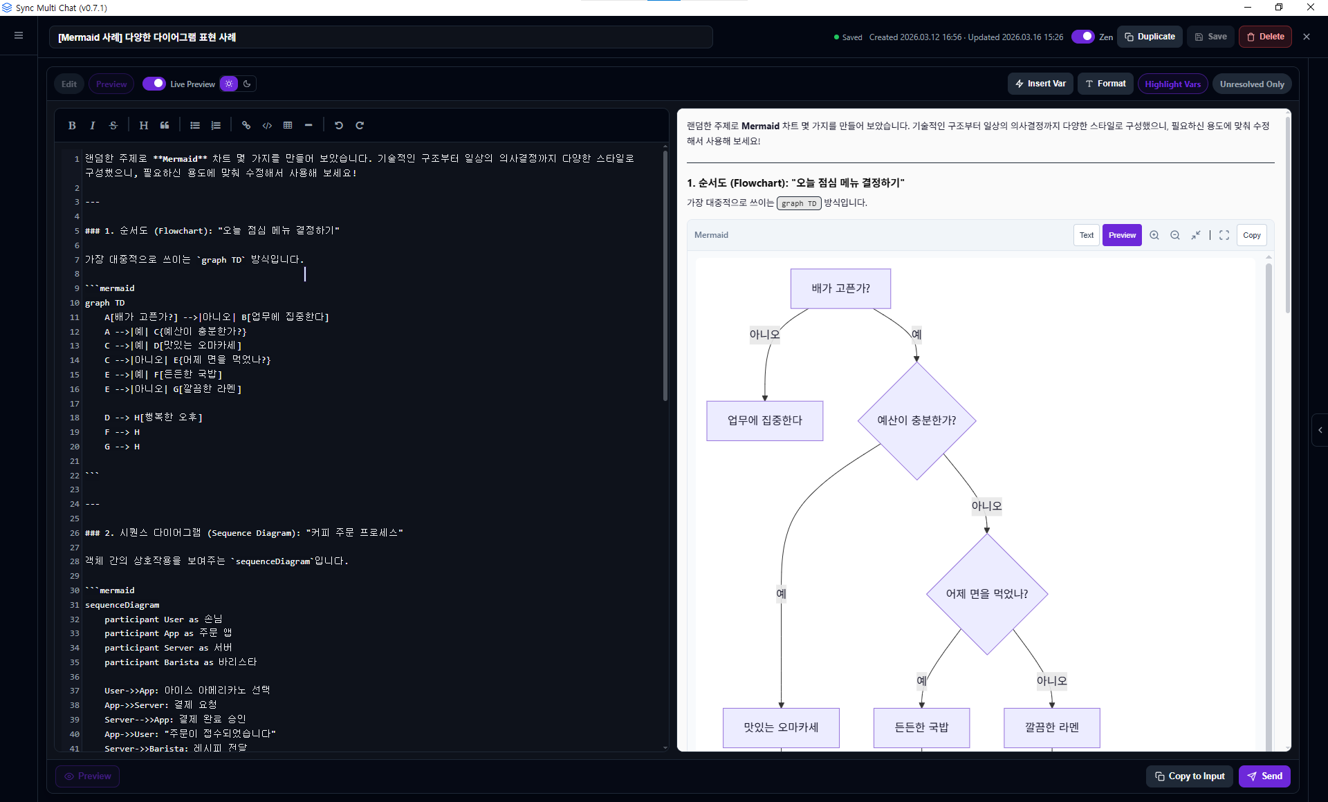 이를 통해 플로우차트, 시퀀스 다이어그램, 간단한 UML 등을 프롬프트에 넣고 전송 전에 바로 확인할 수 있습니다.